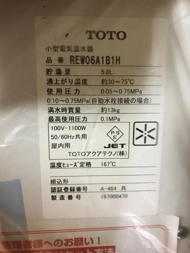 本日はTOTOの「小型電気温水器 REW06A1B1H」をお買取しました!