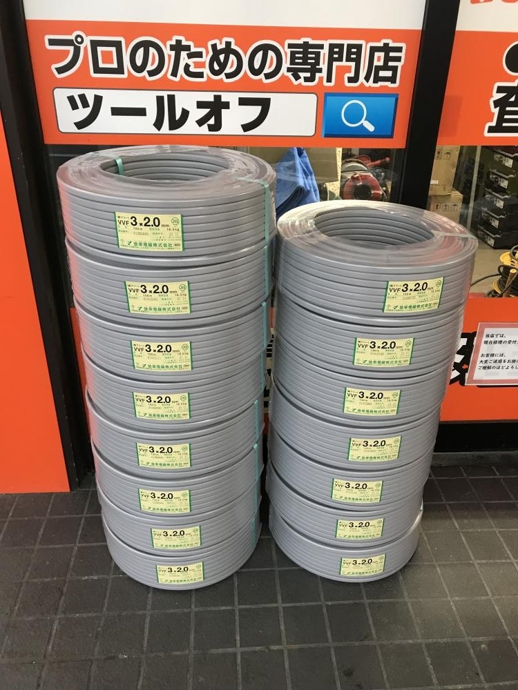弥栄電線 VVFケーブル3×2.0(黒白赤) 100m 15巻を東京都国分寺市のお客様よりお買取りさせていただきました。