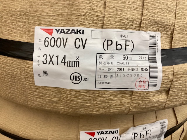 今回は矢崎電線のCVケーブル、3×14㎟の50m巻き(新品未使用)を、東京都板橋区からお売りいただきました!