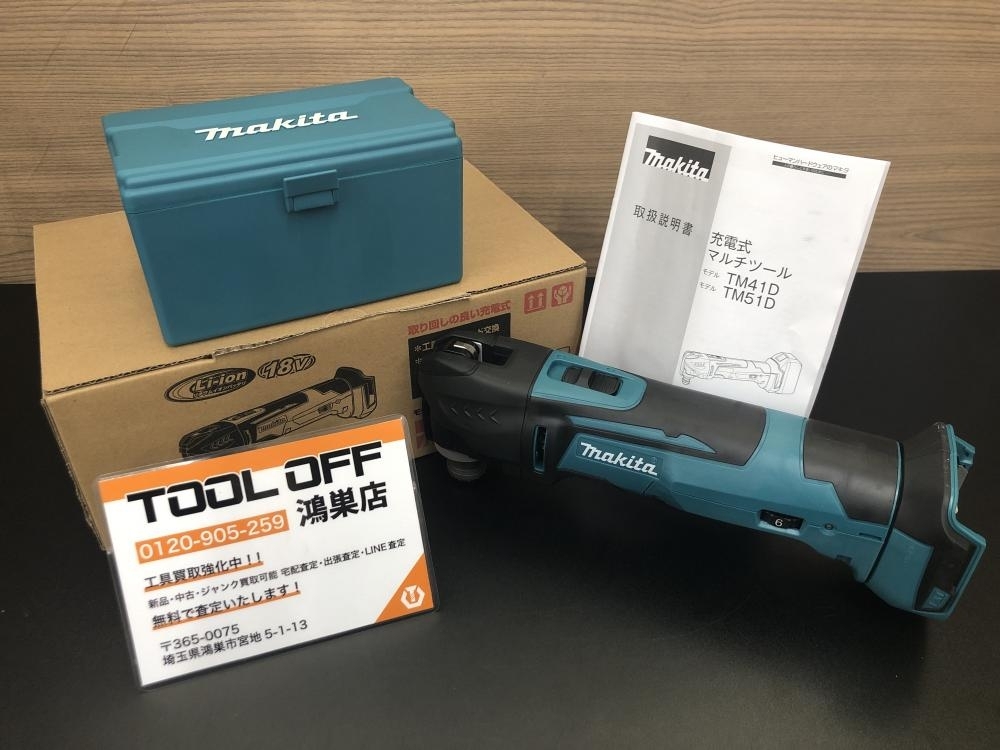 マキタ makitaのTM51DZは、18Vバッテリーを使用したモデルになります。こちらのモデルは既に廃番となっておりますが、マルチツール自体の需要はかなり高く、こちらのモデルも例外ではありません。当店ツールオフ鴻巣店では現在未使用品、中古問わず在庫が不足している為、ぜひお持ち込み頂ければと思います。