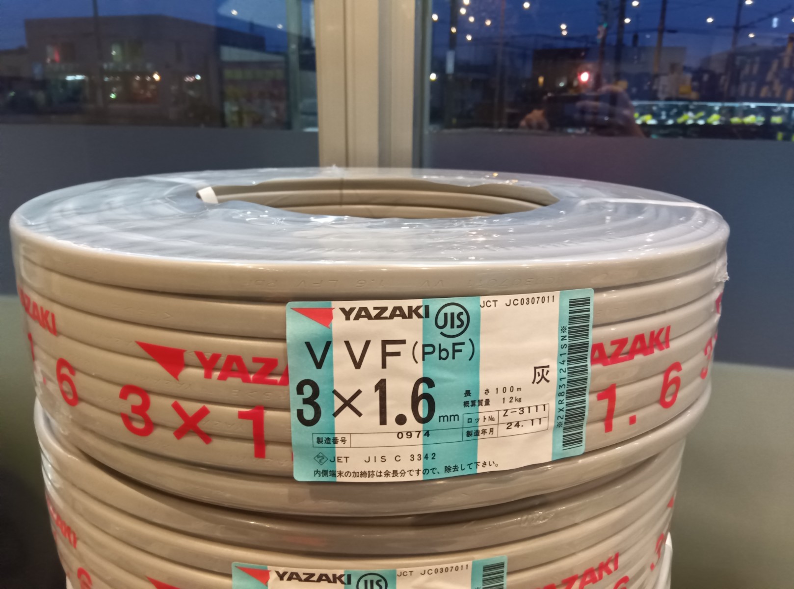 今回は矢崎電線のVVFケーブル、3×1.6mmの100m巻き(新品)を、大阪府堺市からお売りいただきました!