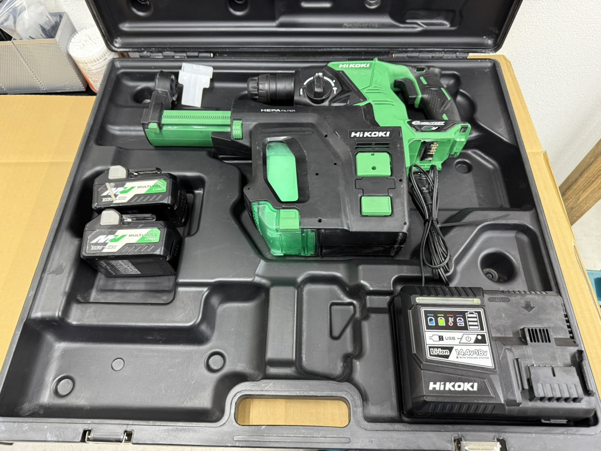 今回お買取りさせていただいたのは『HiKOKI コードレスロータリーハンマドリル DH36DPB 集じん機能付 バッテリ2個+充電器』