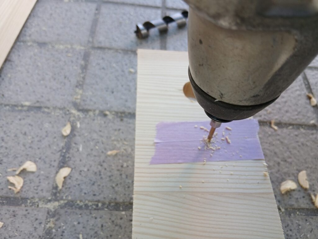 そのままマスキングテープごとドリルで穴を開けます。